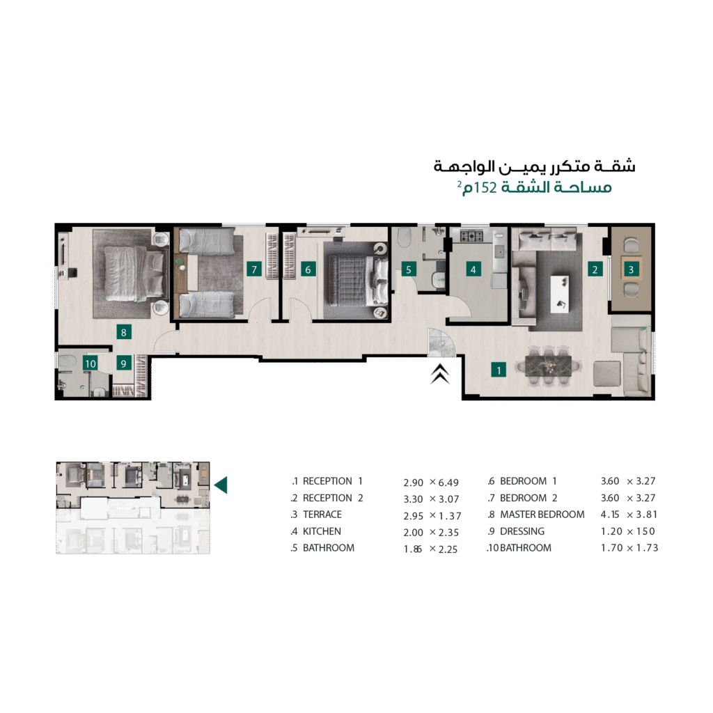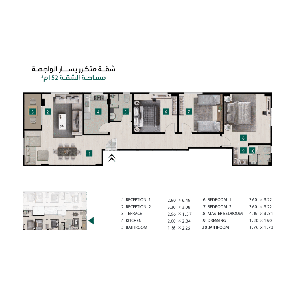 • الوحدات المتكررة: بمساحة 163 م، مصممة بانسيابية تتيح أفضل توزيع للمساحات الداخلية والإضاءة الطبيعية.