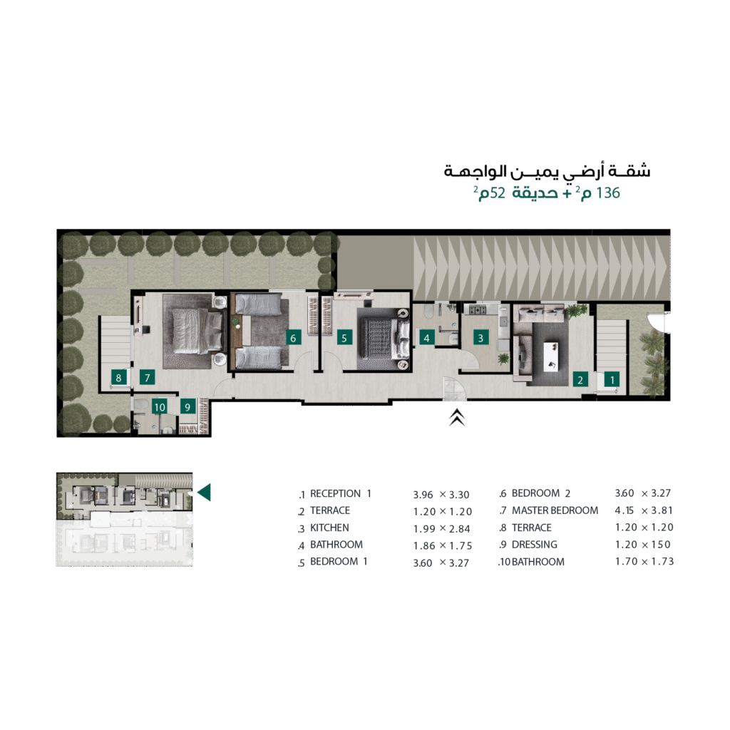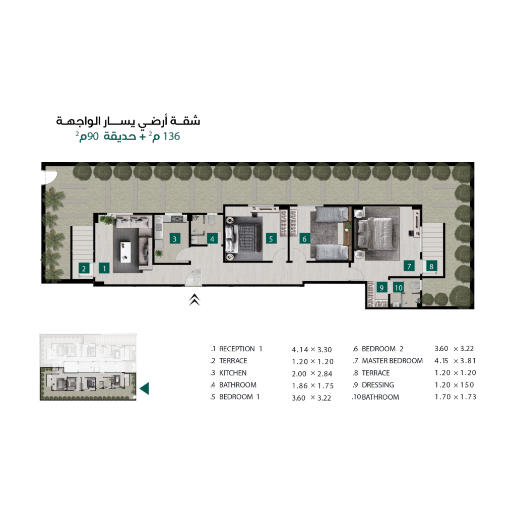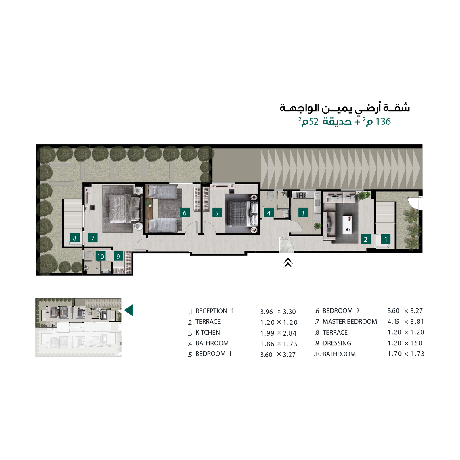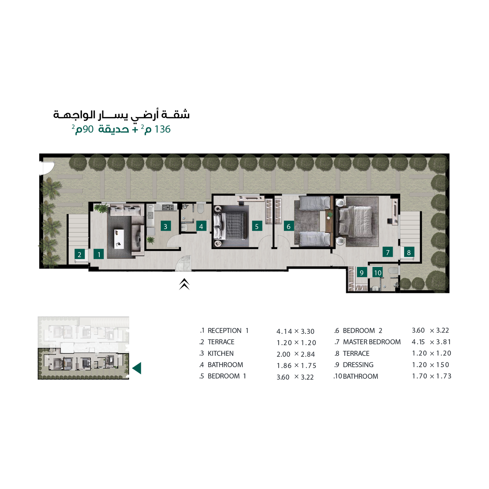 • الوحدات الأرضية: تبدأ من 137 إلى 147 م مع حدائق خاصة تصل إلى 55 م.